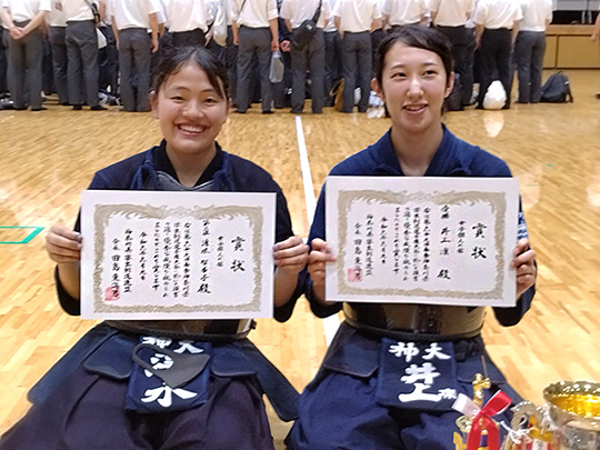 女子個人戦は、4年生の井上凜選手が見事初優勝に輝きました。65人が出場して覇が競われ、決勝戦は東海大学の酒井選手に延長戦の末、面を決めて初優勝しました。また、女子個人戦では、2年生の清水智香子選手が、準決勝戦で惜敗し、第3位となりました。