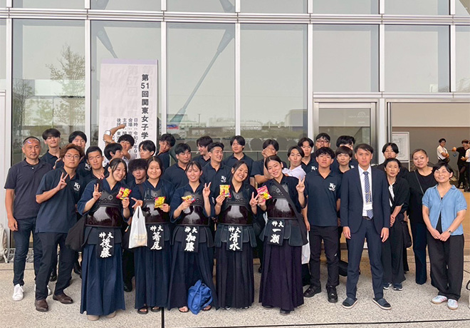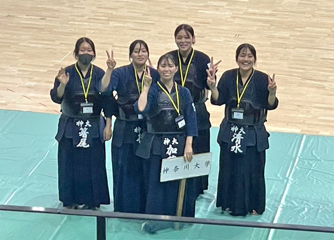 第51回 関東女子学生剣道優勝大会 2025年10月1日 第51回関東女子学生剣道優勝大会が9月20日(土)、東京都調布市にある京王アリーナTOKYO(武蔵野の森総合スポーツプラザ)で開催された。試合は五人制団体戦、84チームがエントリーした。 2回戦の神大は、山梨大学と対戦し、3対0で3回戦に進み、国士館大と対戦、1対4で惜敗した。続く、全日本出場決定戦1回戦は、桜美林大に1対0で勝進み、2回戦大正大に1対3で惜敗し、全日本大会には進めなかった。 【大会結果はこちら】 女子大会での1コマ 試合に出場した選手たち [ 一覧へ戻る ] ホーム 神大剣道部紹介 新着情報一覧 剣道部について 指導者・部員紹介 赤胴大会 1・2年生対抗戦 年間予定・実績 活動計画 活動実績 大会結果 フォトギャラリー 神大剣友会 剣友会名簿 剣友会のお知らせ 神大通信 入部希望の方へ 入試情報 (神奈川大学公式ホームページ) 卒業後の進路